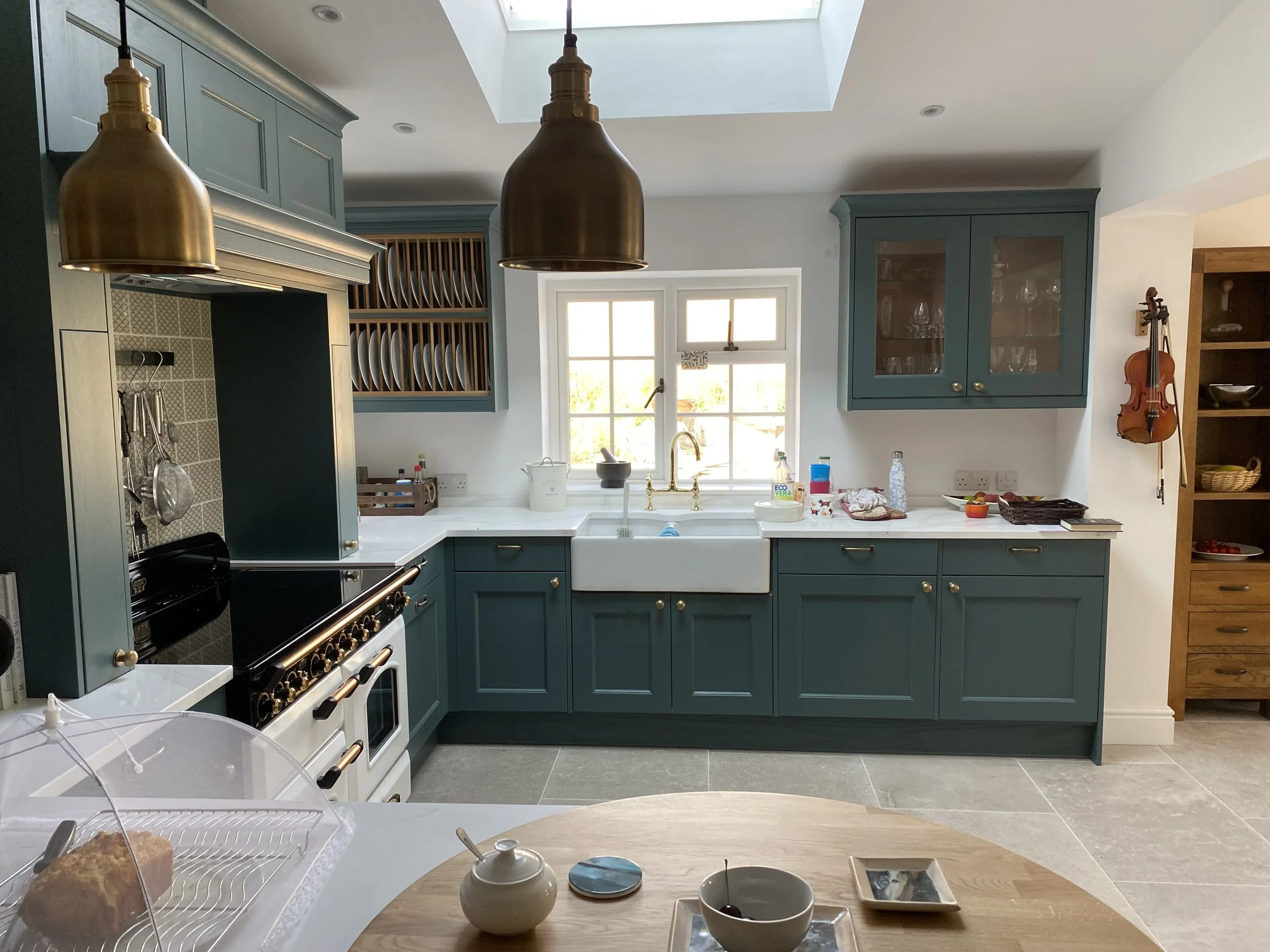 This Baltic Green and brass country kitchen features a bespoke plate rack and mantle handcrafted by Steve from our showroom. We worked closely with our clients and their builders to design and supply their dream kitchen.