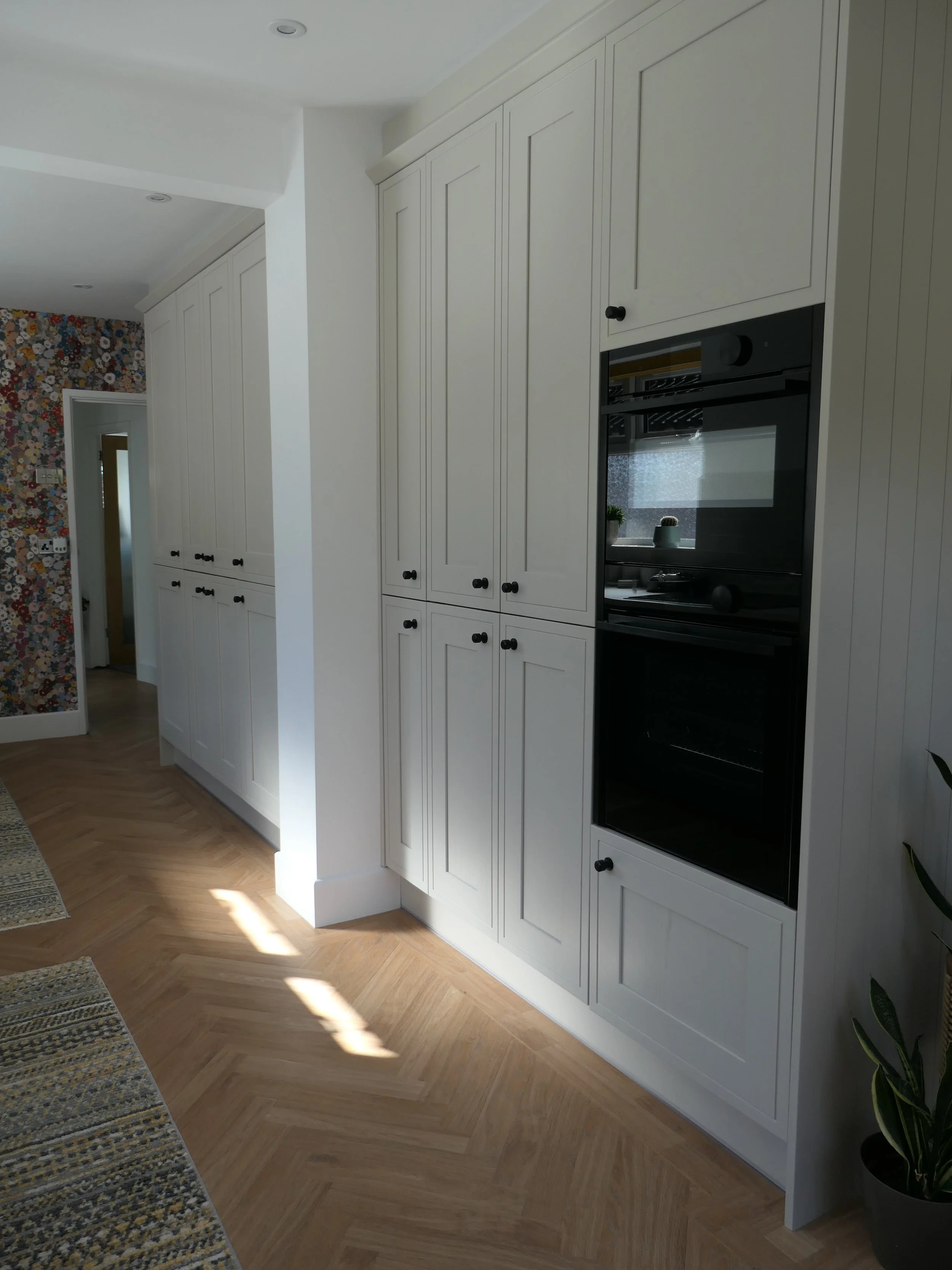 Utilising every inch of space in this large galley kitchen, we created a timeless kitchen that’s equal in both tall storage and worktop space. The Putty and Charcoal painted cabinetry gives this space so much character.