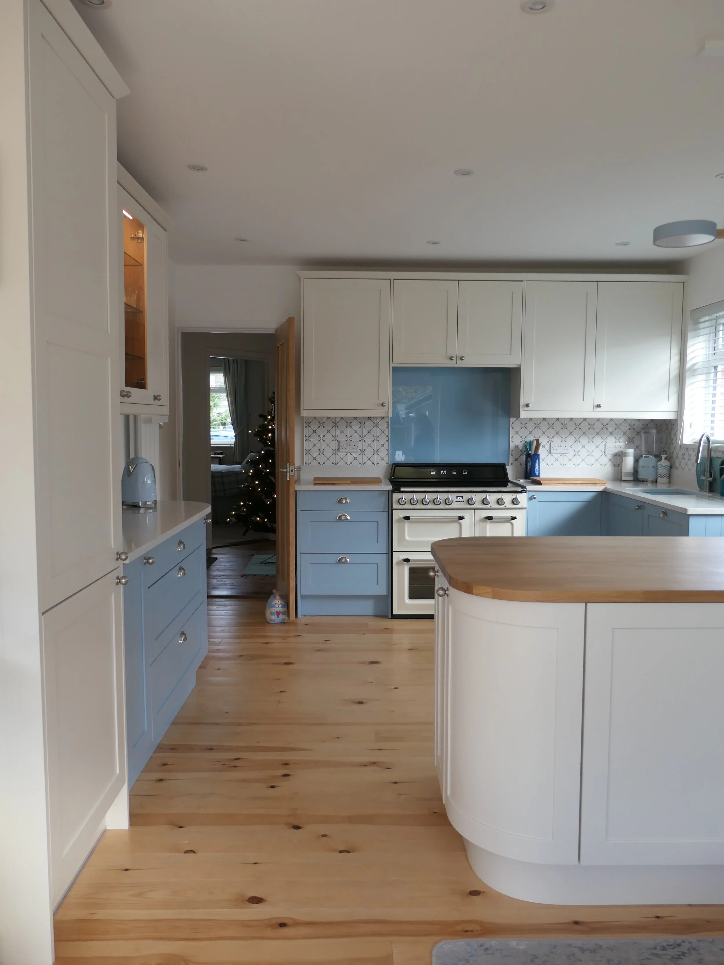 We worked closely with our clients to design and supply this gorgeous fitted shaker kitchen as part of a whole ground floor renovation. The doors are painted in Farrow & Balls’ Lulworth Blue to add a cosy, nautical feel.